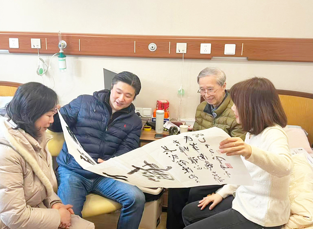 看望期間,民革南藝支部的代表為老師們獻(xiàn)上鮮花及由我校無黨派人士、美術(shù)與書法學(xué)院書法系主任金丹教授親筆題寫的書法作品——“樂韻松齡”,以高雅的藝術(shù)形式表達(dá)了對老師藝術(shù)人生的深厚敬意和健康長壽的美好祝愿。吳式銓老師對民革南藝支部的到訪表示感謝,并衷心祝愿學(xué)校事業(yè)蓬勃發(fā)展,蒸蒸日上。